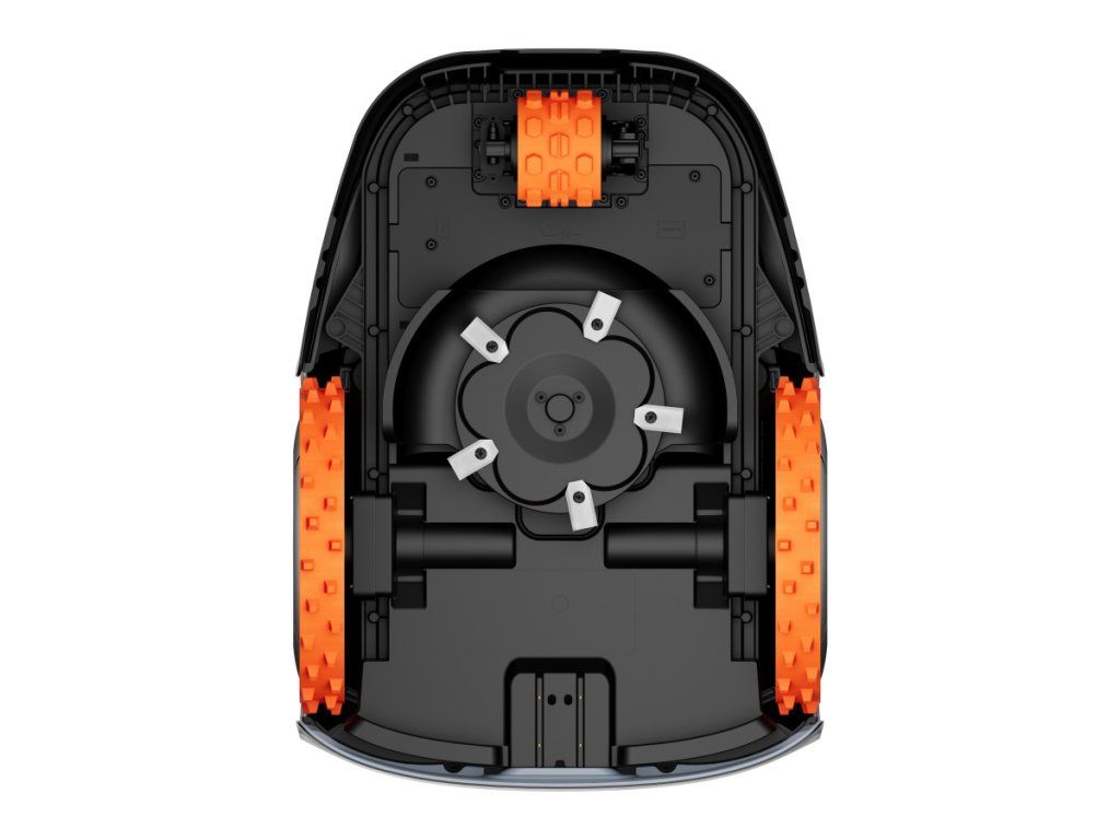 Díky pohonu všech kol (AWD) je tento model ideální i do náročnějších zahrad – zvládá nerovnosti, horší povrch i svahy až do 45 %, kde běžné robotické sekačky často ztrácejí trakci. Dvě velká přední kola jsou neustále v záběru a táhnou sekačku vpřed, zatímco zadní řiditelné kolo se připojuje jen ve chvíli, kdy je to potřeba.