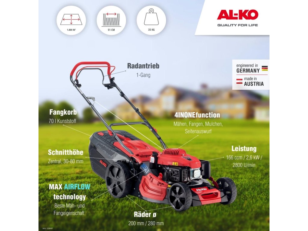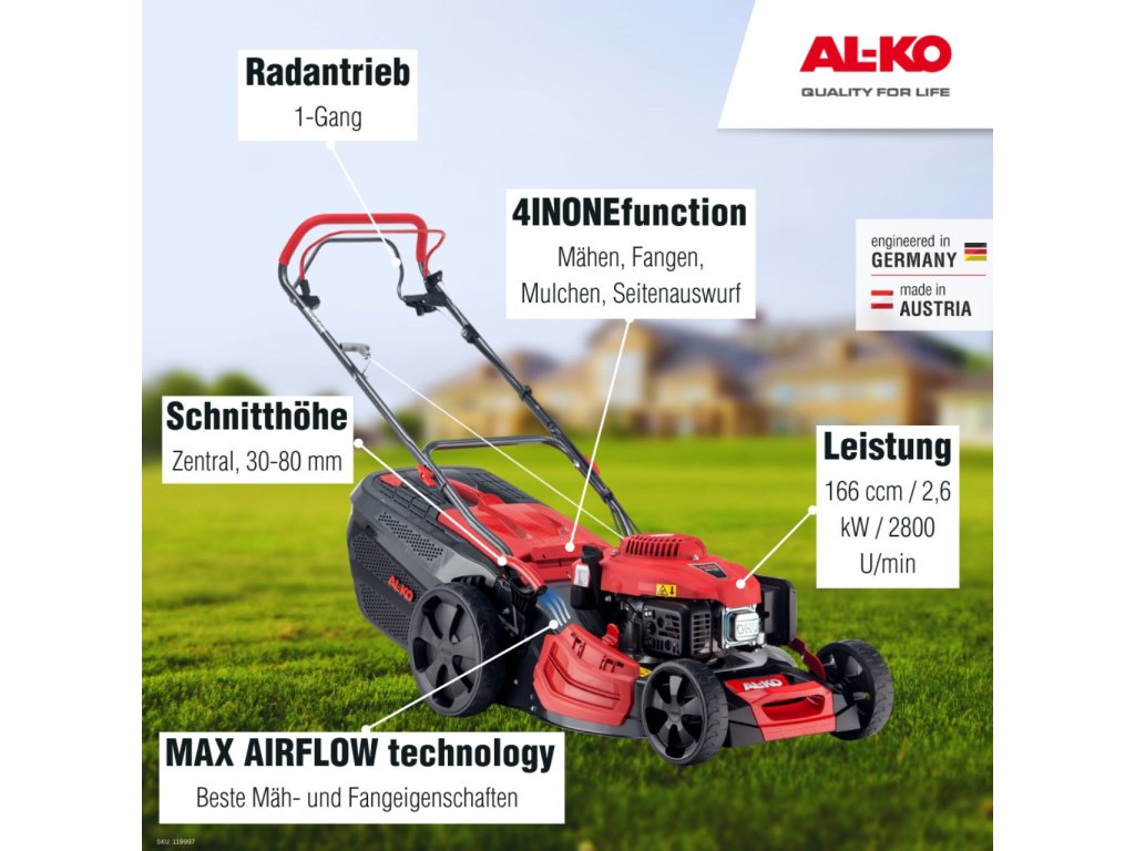 Motor AL-KO Pro 170 o výkonu 2,6 kW s technologií OHV dosahuje vynikající účinnosti. Díky 1-rychlostnímu pohonu kol a XXL hladkým běhům kol je pokrok v zahradě bez námahy.