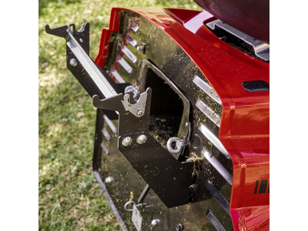 Odolné žací ústrojí je vyrobeno z ocelového plechu a obsahuje dva nože pro čisté posečení trávy a lze ji sejmout v několika jednoduchých krocích.
